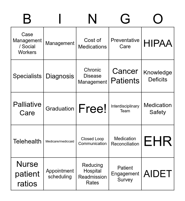 This bingo card has a free space and 28 words: EHR, Nurse, Cancer Patients, Patient Engagement Survey, Specialists, Cost of Medications, Management, Telehealth, Interdisciplinary Team, Nurse patient ratios, Palliative Care, Preventative Care, Appointment scheduling, Reducing Hospital Readmission Rates, Knowledge Deficits, UAP, Medicare/mediccaid, Diagnosis, Chronic Disease Management, Closed Loop Communication, Case Management / Social Workers, Evidence based practices, AIDET, Graduation, Medication Safety, Medication Reconciliation, HIPAA and Hospice.