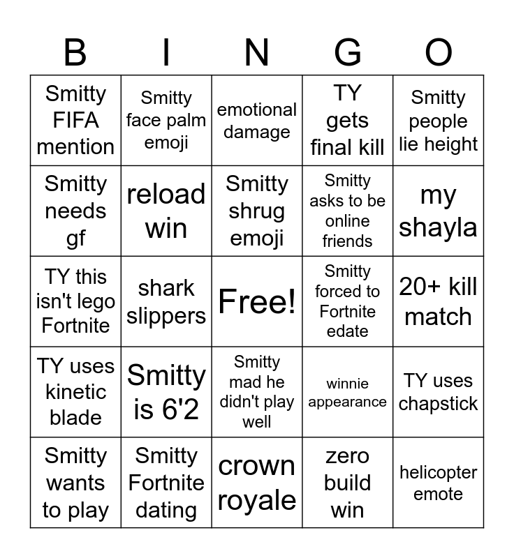 This bingo card has a free space and 24 words: Smitty is 6'2, Smitty Fortnite dating, Smitty shrug emoji, Smitty wants to play, Smitty people lie height, Smitty FIFA mention, Smitty needs gf, Smitty face palm emoji, Smitty forced to Fortnite edate, Smitty mad he didn't play well, Smitty asks to be online friends, TY this isn't lego Fortnite, winnie appearance, TY uses chapstick, reload win, zero build win, 20+ kill match, emotional damage, my shayla, shark slippers, helicopter emote, TY uses kinetic blade, TY gets final kill and crown royale.
