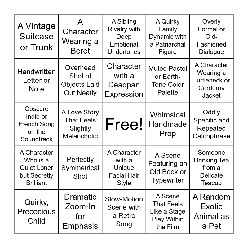 This bingo card has a free space and 25 words: Perfectly Symmetrical Shot, Slow-Motion Scene with a Retro Song, Character with a Deadpan Expression, Quirky, Precocious Child, Overly Formal or Old-Fashioned Dialogue, A Vintage Suitcase or Trunk, Handwritten Letter or Note, A Character Wearing a Beret, Whimsical Handmade Prop, A Character with a Unique Facial Hair Style, Muted Pastel or Earth-Tone Color Palette, Obscure Indie or French Song on the Soundtrack, A Scene Featuring an Old Book or Typewriter, Someone Drinking Tea from a Delicate Teacup, Overhead Shot of Objects Laid Out Neatly, A Character Who is a Failed Artist or Writer, Oddly Specific and Repeated Catchphrase, A Sibling Rivalry with Deep Emotional Undertones, A Character Wearing a Turtleneck or Corduroy Jacket, A Love Story That Feels Slightly Melancholic, A Random Exotic Animal as a Pet, Dramatic Zoom-In for Emphasis, A Character Who is a Quiet Loner but Secretly Brilliant, A Quirky Family Dynamic with a Patriarchal Figure and A Scene That Feels Like a Stage Play Within the Film.