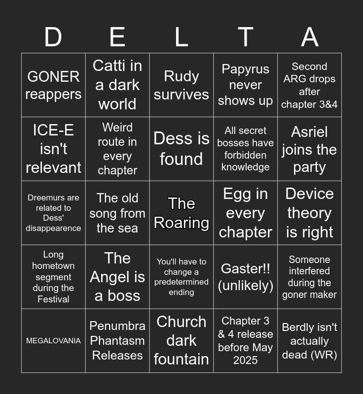 This bingo card has a free space and 24 words: The Angel is a boss, Penumbra Phantasm Releases, Dess is found, MEGALOVANIA, Second ARG drops after chapter 3&4, GONER reappers, ICE-E isn't relevant, Catti in a dark world, Egg in every chapter, You'll have to change a predetermined ending, All secret bosses have forbidden knowledge, Dreemurs are related to Dess' disappearence, Gaster!! (unlikely), Someone interfered during the goner maker, Weird route in every chapter, Chapter 3 & 4 release before May 2025, Device theory is right, Rudy survives, Asriel joins the party, The old song from the sea, Berdly isn't actually dead (WR), Long hometown segment during the Festival, Papyrus never shows up and Church dark fountain.