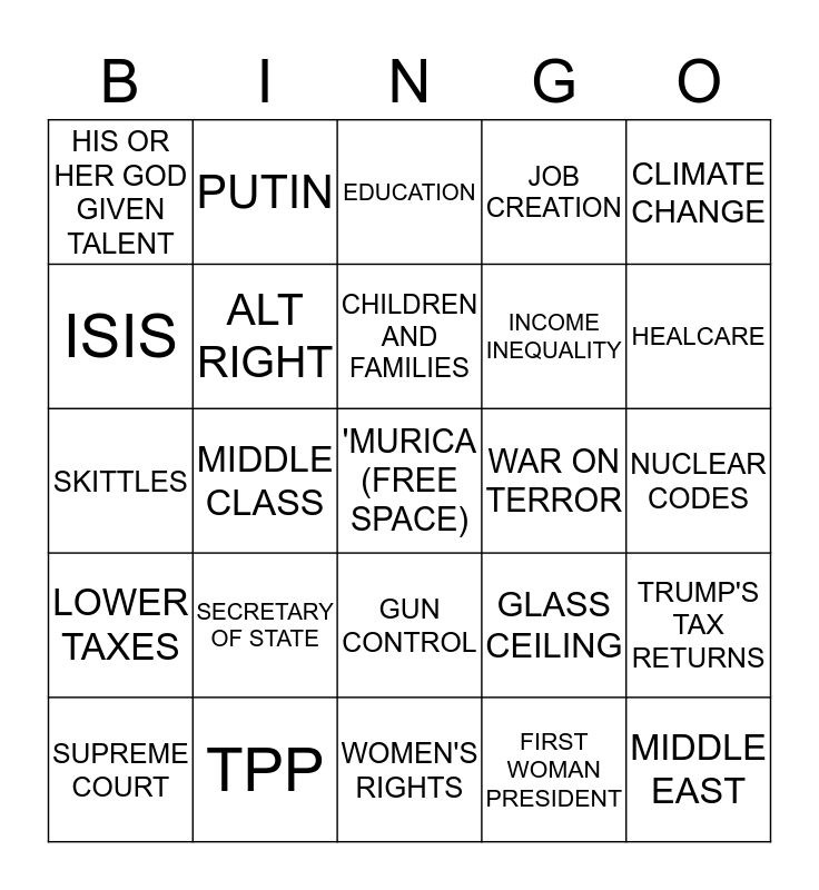 This bingo card has a free space and 24 words: SECRETARY OF STATE, TPP, CHILDREN AND FAMILIES, SUPREME COURT, CLIMATE CHANGE, HIS OR HER GOD GIVEN TALENT, ISIS, PUTIN, WAR ON TERROR, GUN CONTROL, INCOME INEQUALITY, SKITTLES, GLASS CEILING, TRUMP'S TAX RETURNS, ALT RIGHT, FIRST WOMAN PRESIDENT, NUCLEAR CODES, EDUCATION, HEALCARE, MIDDLE CLASS, MIDDLE EAST, LOWER TAXES, JOB CREATION and WOMEN'S RIGHTS.
