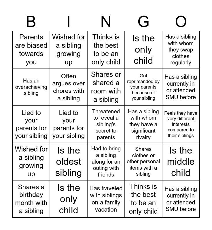 This bingo card has a free space and 49 words: Free!, Has a sibling currently in or attended SMU before, Shares a birthday month with a sibling, Has traveled with siblings on a family vacation, Is the oldest sibling, Had to bring a sibling along for an outing with friends, Wished for a sibling growing up, Has a sibling with a significant age gap (more than 5 years), Has an overachieving sibling, Got into a physical fight with a sibling before, Often argues over chores with a sibling, Is the only child, Is the middle child, Shares clothes or other personal items with a sibling, Feels they have very different interests compared to their siblings, Only child but formed sibling-liked relationship with cousins/close friends, Shares or shared a room with a sibling, Has a sibling with whom they have a significant rivalry, Is the favorite child, Has a sibling with whom they swap clothes regularly, Lied to your parents for your sibling, Thinks is the best to be an only child, Parents are biased towards you, Got reprimanded by your parents because of your sibling, Enjoys a very close bond with a sibling, Has a sibling currently in or attended SMU before, Shares a birthday month with a sibling, Is the oldest sibling, Had to bring a sibling along for an outing with friends, Wished for a sibling growing up, Has a sibling with a significant age gap (more than 5 years), Has an overachieving sibling, Got into a physical fight with a sibling before, Often argues over chores with a sibling, Is the only child, Threatened to reveal a sibling's secret to parents, Is the middle child, Shares clothes or other personal items with a sibling, Feels they have very different interests compared to their siblings, Only child but formed sibling-liked relationship with cousins/close friends, Shares or shared a room with a sibling, Has a sibling with whom they have a significant rivalry, Is the favorite child, Has a sibling with whom they swap clothes regularly, Lied to your parents for your sibling, Thinks is the best to be an only child, Parents are biased towards you, Got reprimanded by your parents because of your sibling and Enjoys a very close bond with a sibling.