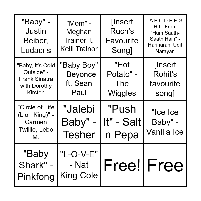 This bingo card has 17 words: Free!, "Baby Shark" - Pinkfong, [Insert Ruch's Favourite Song], "Baby" - Justin Beiber, Ludacris, "Jalebi Baby" - Tesher, "A B C D E F G H I - From "Hum Saath-Saath Hain" - Hariharan, Udit Narayan, "Ice Ice Baby" - Vanilla Ice, "Hot Potato" - The Wiggles, [Insert Rohit's favourite song], "Baby Boy" - Beyonce ft. Sean Paul, "L-O-V-E" - Nat King Cole, "Push It" - Salt n Pepa, "Baby, It's Cold Outside" - Frank Sinatra with Dorothy Kirsten, "Mom" - Meghan Trainor ft. Kelli Trainor, "Circle of Life (Lion King)" - Carmen Twillie, Lebo M., "Mamma Mia" - ABBA and Free.