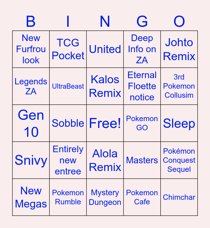 This bingo card has a free space and 24 words: Entirely new entree, Pokemon Rumble, Kalos Remix, New Megas, Johto Remix, New Furfrou look, Legends ZA, TCG Pocket, Pokemon GO, Alola Remix, Eternal Floette notice, Gen 10, Masters, Pokémon Conquest Sequel, UltraBeast, Pokemon Cafe, Sleep, United, 3rd Pokemon Collusim, Sobble, Chimchar, Snivy, Deep Info on ZA and Mystery Dungeon.