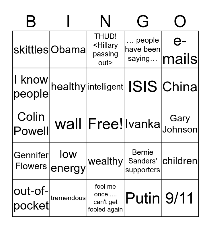This bingo card has a free space and 30 words: tremendous, deplorables, wall, Yuuuuge!, skittles, THUD! <Hillary passing out>, healthy, wealthy, Ivanka, fool me once .... can't get fooled again, Gary Johnson, 9/11, Putin, liar, China, Crooked Hillary, Bernie Sanders' supporters, Gennifer Flowers, low energy, e-mails, Colin Powell, lizards, Obama, ISIS, I know people, … people have been saying…, children, out-of-pocket, intelligent and what families need....