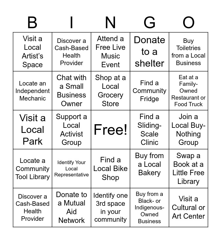 This bingo card has a free space and 24 words: Identify Your Local Representative, Donate to a Mutual Aid Network, Shop at a Local Grocery Store, Discover a Cash-Based Health Provider, Buy Toiletries from a Local Business, Visit a Local Artist’s Space, Locate an Independent Mechanic, Discover a Cash-Based Health Provider, Find a Sliding-Scale Clinic, Find a Local Bike Shop, Find a Community Fridge, Visit a Local Park, Buy from a Local Bakery, Swap a Book at a Little Free Library, Chat with a Small Business Owner, Buy from a Black- or Indigenous-Owned Business, Join a Local Buy-Nothing Group, Attend a Free Live Music Event, Eat at a Family-Owned Restaurant or Food Truck, Support a Local Activist Group, Visit a Cultural or Art Center, Locate a Community Tool Library, Donate to a shelter and Identify one 3rd space in your community.