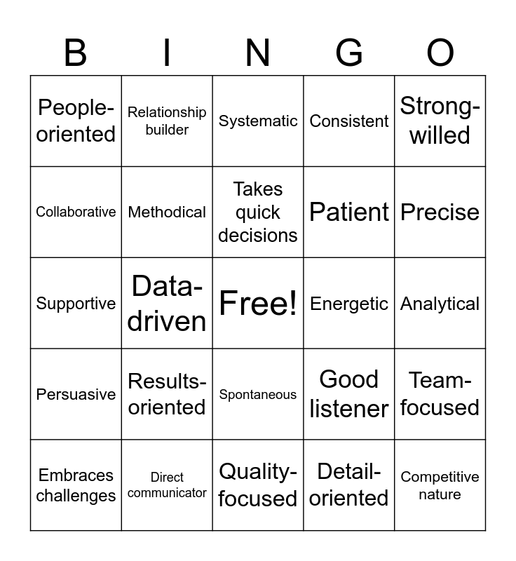 This bingo card has a free space and 24 words: Results-oriented, Direct communicator, Takes quick decisions, Embraces challenges, Strong-willed, People-oriented, Collaborative, Relationship builder, Energetic, Spontaneous, Patient, Supportive, Good listener, Team-focused, Methodical, Detail-oriented, Analytical, Systematic, Precise, Data-driven, Competitive nature, Persuasive, Consistent and Quality-focused.