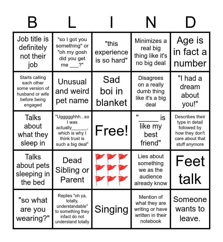 This bingo card has a free space and 24 words: Dead Sibling or Parent, Replies "oh ya, totally, understandable" to something they infact do not understand totally, Sad boi in blanket, "so what are you wearing?", Age is in fact a number, Job title is definitely not their job, Starts calling each other some version of husband or wife before being engaged, "so I got you something" or "oh my gosh did you get me ___?", "_____ is like my best friend", 🚩🚩🚩🚩🚩🚩🚩🚩🚩, Disagrees on a really dumb thing like it's a big deal, Talks about what they sleep in, Lies about something we as the audience already know, Feet talk, Unusual and weird pet name, Mention of what they are writing or have written in their notebook, Describes their type in detail followed by how they don't care about that stuff anymore, "this experience is so hard", "I had a dream about you!", "Uggggghhh...so I was actually______, which is why I think trust is such a big deal", Someone wants to leave., Talks about pets sleeping in the bed, Minimizes a real big thing like it's no big deal and Singing.
