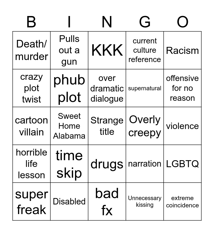 This bingo card has a free space and 24 words: time skip, Disabled, over dramatic dialogue, super freak, Racism, Death/ murder, crazy plot twist, Pulls out a gun, Overly creepy, drugs, supernatural, cartoon villain, narration, LGBTQ, phub plot, Unnecessary kissing, violence, KKK, offensive for no reason, Sweet Home Alabama, extreme coincidence, horrible life lesson, current culture reference and bad fx.