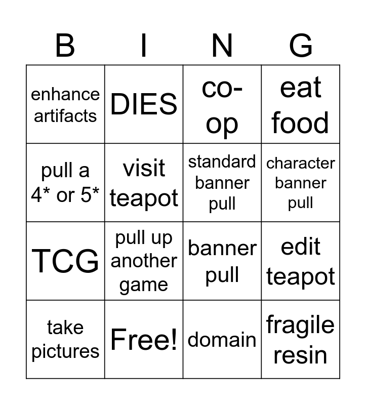 This bingo card has 27 words: any quest, commissions, TCG, team comp without kazuha, visit teapot, co-op, DIES, fragile resin, Free!, endgame content, banner pull, eat food, fight boss, explore, pull up another game, someone comments on AMOGUS, standard banner pull, character banner pull, weapon banner pull, enhance artifacts, domain, reach max artifacts, edit teapot, take pictures, mauled by boar, pull a 4* or 5* and fishing.