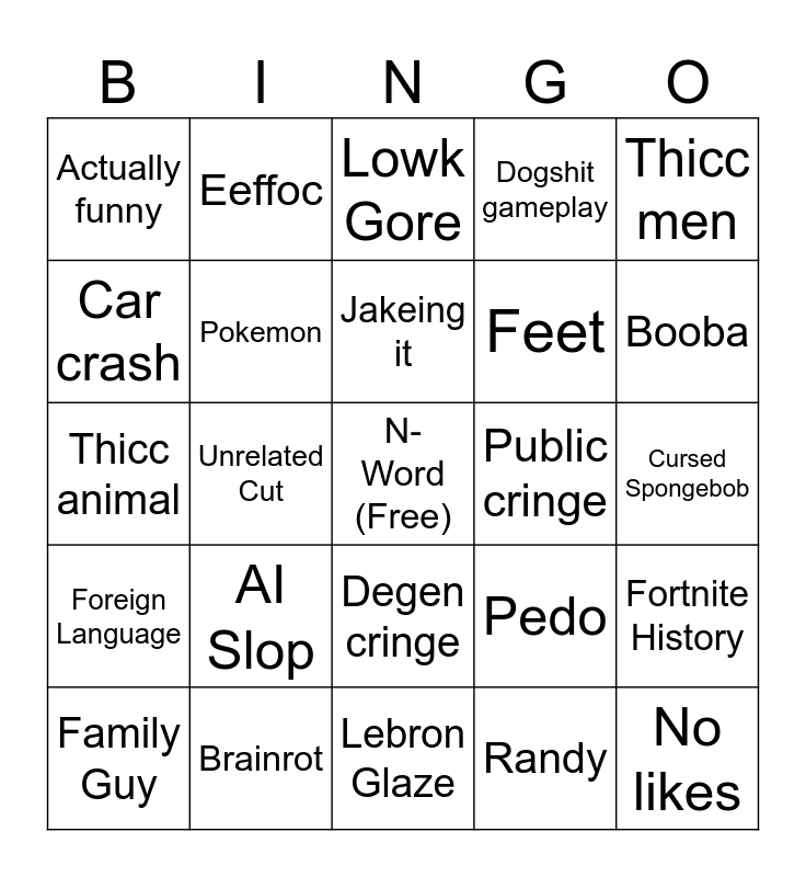 This bingo card has a free space and 24 words: AI Slop, Brainrot, Jakeing it, Family Guy, Thicc men, Actually funny, Car crash, Eeffoc, Public cringe, Degen cringe, Feet, Thicc animal, Pedo, Fortnite History, Pokemon, Randy, Cursed Spongebob, Lowk Gore, Booba, Unrelated Cut, No likes, Foreign Language, Dogshit gameplay and Lebron Glaze.