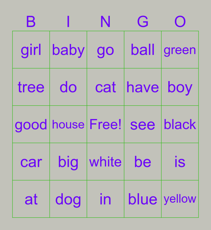 This bingo card has a free space and 24 words: big, dog, cat, at, green, girl, tree, baby, see, white, have, good, be, is, do, blue, black, go, boy, house, yellow, car, ball and in.
