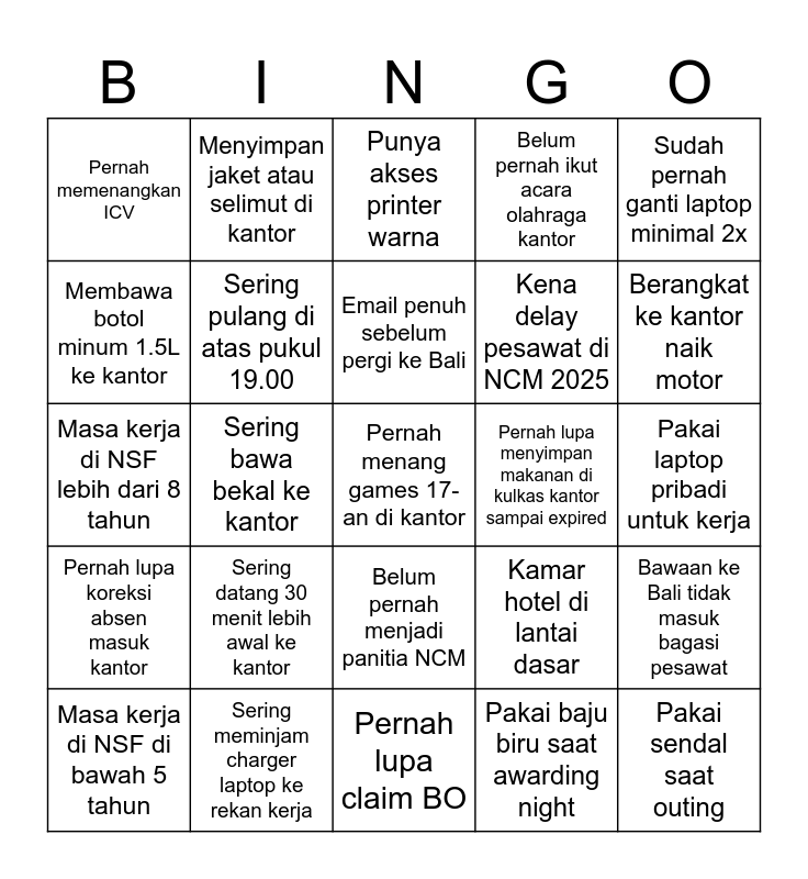 This bingo card has a free space and 24 words: Sering datang 30 menit lebih awal ke kantor, Sering meminjam charger laptop ke rekan kerja, Email penuh sebelum pergi ke Bali, Masa kerja di NSF di bawah 5 tahun, Sudah pernah ganti laptop minimal 2x, Pernah memenangkan ICV, Membawa botol minum 1.5L ke kantor, Menyimpan jaket atau selimut di kantor, Pernah lupa menyimpan makanan di kulkas kantor sampai expired, Belum pernah menjadi panitia NCM, Kena delay pesawat di NCM 2025, Masa kerja di NSF lebih dari 8 tahun, Kamar hotel di lantai dasar, Bawaan ke Bali tidak masuk bagasi pesawat, Sering pulang di atas pukul 19.00, Pakai baju biru saat awarding night, Pakai laptop pribadi untuk kerja, Punya akses printer warna, Berangkat ke kantor naik motor, Sering bawa bekal ke kantor, Pakai sendal saat outing, Pernah lupa koreksi absen masuk kantor, Belum pernah ikut acara olahraga kantor and Pernah lupa claim BO.