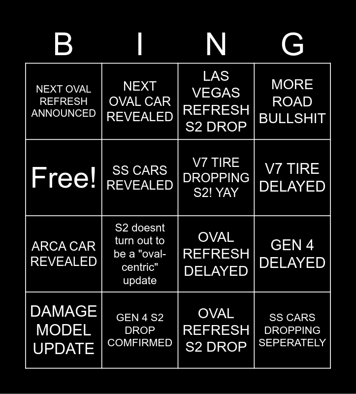 This bingo card has 16 words: GEN 4 S2 DROP COMFIRMED, GEN 4 DELAYED, LAS VEGAS REFRESH S2 DROP, NEXT OVAL REFRESH ANNOUNCED, ARCA CAR REVEALED, NEXT OVAL CAR REVEALED, OVAL REFRESH DELAYED, OVAL REFRESH S2 DROP, Free!, SS CARS REVEALED, DAMAGE MODEL UPDATE, MORE ROAD BULLSHIT, S2 doesnt turn out to be a "oval-centric" update, V7 TIRE DELAYED, V7 TIRE DROPPING S2! YAY and SS CARS DROPPING SEPERATELY.