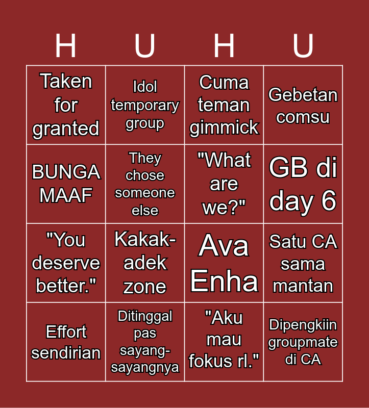 This bingo card has 16 words: Ditinggal pas sayang-sayangnya, Satu CA sama mantan, Cuma teman gimmick, Taken for granted, "You deserve better.", Idol temporary group, Ava Enha, "Aku mau fokus rl.", BUNGA MAAF, They chose someone else, Effort sendirian, Gebetan comsu, Kakak-adek zone, GB di day 6, "What are we?" and Dipengkiin groupmate di CA.