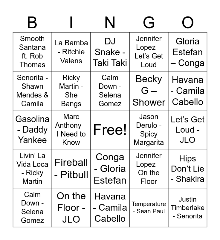 This bingo card has a free space and 56 words: Margaritaville - Jimmy Buffet, Calm Down - Selena Gomez, Despacito - Luis Fonsi, Smooth Santana ft. Rob Thomas, Havana - Camila Cabello, Enrique Iglesias – Bailamos, Ricky Martin - She Bangs, Pitbull ft. Ne-Yo – Time of Our Lives, Becky G – Shower, Shakira – Whenever Wherever, Jennifer Lopez – Let’s Get Loud, Shawn Mendes & Camila - Senorita, Daddy Yankee – Gasolina, J Balvin - Mi Gente, Ricky Martin – Livin’ La Vida Loca, Ritchie Valens – La Bamba, Gloria Estefan – Conga, Marc Anthony – I Need to Know, Enrique Iglesias – Escape, Justin Timberlake - Senorita, Jason Derulo - Spicy Margarita, Pitbull – Fireball, Jennifer Lopez – On the Floor, DJ Snake - Taki Taki, Margaritaville - Jimmy Buffet, Calm Down - Selena Gomez, Despacito - Luis Fonsi, Smooth Santana, Havana - Camila Cabello, Bailamos - Enrique Iglesias, She Bangs - Ricky Martin, Time of Our Lives - Pitbull, Shower - Becky G, Whenever Wherever - Shakira, Let’s Get Loud - JLO, Senorita - Shawn Mendes & Camila, Gasolina - Daddy Yankee, Mi Gente - J Balvin, Livin’ La Vida Loca - Ricky Martin, La Bamba - Ritchie Valens, Conga - Gloria Estefan, I Need to Know - Marc Anthony, Escape - Enrique Iglesias, Senorita - Justin Timberlake, Spicy Margarita - Jason Derulo, Fireball - Pitbull, On the Floor - JLO, Taki Taki - DJ Snake, Genie in a Bottle - Christina Aguilera, Macarena - Los Del Rio, Temperature - Sean Paul, Light My Fire - Jose Feliciano, Copacabana - Barry Manilow, Turn the Beat Around - Gloria Estefan, Hips Don’t Lie - Shakira and She Bangs - Ricky Martin.