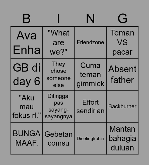 This bingo card has 16 words: Gebetan comsu, Backburner, Friendzone, Ava Enha, "Aku mau fokus rl.", "What are we?", Effort sendirian, Diselingkuhin, GB di day 6, They chose someone else, BUNGA MAAF., Teman VS pacar, Ditinggal pas sayang-sayangnya, Absent father, Cuma teman gimmick and Mantan bahagia duluan.