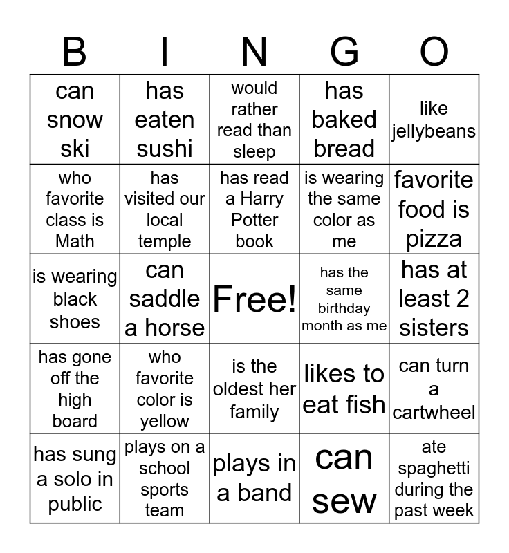 This bingo card has a free space and 24 words: who favorite color is yellow, plays on a school sports team, has read a Harry Potter book, has sung a solo in public, like jellybeans, can snow ski, who favorite class is Math, has eaten sushi, has the same birthday month as me, is the oldest her family, is wearing the same color as me, is wearing black shoes, likes to eat fish, can turn a cartwheel, has visited our local temple, can sew, has at least 2 sisters, would rather read than sleep, favorite food is pizza, can saddle a horse, ate spaghetti during the past week, has gone off the high board, has baked bread and plays in a band.