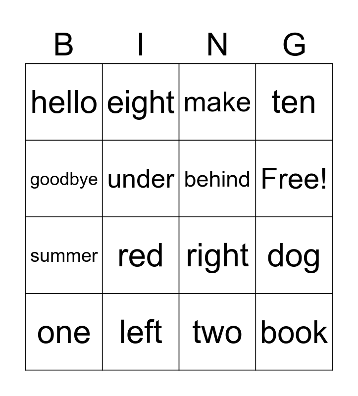 This bingo card has 17 words: two, one, make, hello, red, ten, dog, behind, Free!, under, left, right, goodbye, eight, summer, teacher and book.