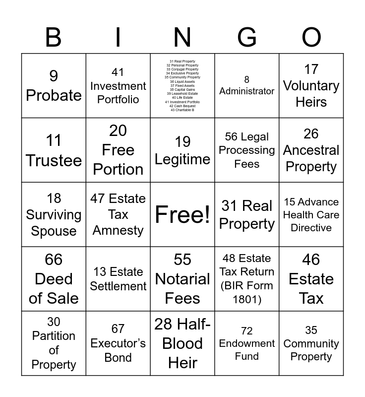 This bingo card has a free space and 80 words: 1 Estate Planning 2 Estate 3 Will 4 Last Will and Testament 5 Testator 6 Intestate Succession 7 Executor 8 Administrator 9 Probate 10 Trust 11 Trustee 12 Guardian 13 Estate Settlement 14 Legal Heir’s Certificate 15 Advance Health Care Direct, 16 Compulsory Heirs 17 Voluntary Heirs 18 Surviving Spouse 19 Legitime 20 Free Portion 21 Preterition 22 Disinheritance 23 Illegitimate Child 24 Adopted Child 25 Representation 26 Ancestral Property 27 Full-Blood Heir 28 Half-Blood Heir 29 Es, 31 Real Property 32 Personal Property 33 Conjugal Property 34 Exclusive Property 35 Community Property 36 Liquid Assets 37 Fixed Assets 38 Capital Gains 39 Leasehold Estate 40 Life Estate 41 Investment Portfolio 42 Cash Bequest 43 Charitable B, 46 Estate Tax 47 Estate Tax Amnesty 48 Estate Tax Return (BIR Form 1801) 49 Inheritance Tax (former tax, now part of Estate Tax) 50 Donor’s Tax 51 Capital Gains Tax 52 Documentary Stamp Tax 53 Transfer Tax 54 Probate Court Fees 55 Notarial Fees, 61 Power of Attorney 62 Revocable Trust 63 Irrevocable Trust 64 Codicil 65 Deed of Donation 66 Deed of Sale 67 Executor’s Bond 68 Guardianship of Minor’s Estate 69 Life Insurance Policy 70 Charitable Remainder Trust 71 Wealth Protection 72 Endo, 1 Estate Planning, 2 Estate, 3 Will, 4 Last Will and Testament, 5 Testator, 6 Intestate Succession, 7 Executor, 8 Administrator, 9 Probate, 10 Trust, 11 Trustee, 12 Guardian, 13 Estate Settlement, 14 Legal Heir’s Certificate, 15 Advance Health Care Directive, 16 Compulsory Heirs, 17 Voluntary Heirs, 18 Surviving Spouse, 19 Legitime, 20 Free Portion, 21 Preterition, 22 Disinheritance, 23 Illegitimate Child, 24 Adopted Child, 25 Representation, 26 Ancestral Property, 27 Full-Blood Heir, 28 Half-Blood Heir, 29 Escheat, 30 Partition of Property, 31 Real Property, 32 Personal Property, 33 Conjugal Property, 34 Exclusive Property, 35 Community Property, 36 Liquid Assets, 37 Fixed Assets, 38 Capital Gains, 39 Leasehold Estate, 40 Life Estate, 41 Investment Portfolio, 42 Cash Bequest, 43 Charitable Bequest, 44 Trust Fund, 45 Business Ownership Interest, 46 Estate Tax, 47 Estate Tax Amnesty, 48 Estate Tax Return (BIR Form 1801), 49 Inheritance Tax (former tax, now part of Estate Tax), 50 Donor’s Tax, 51 Capital Gains Tax, 52 Documentary Stamp Tax, 53 Transfer Tax, 54 Probate Court Fees, 55 Notarial Fees, 56 Legal Processing Fees, 57 Wealth Transfer Tax, 58 Tax-Free Transfers, 59 BIR Clearance for Estate, 60 Title Transfer Fee, 61 Power of Attorney, 62 Revocable Trust, 63 Irrevocable Trust, 64 Codicil, 65 Deed of Donation, 66 Deed of Sale, 67 Executor’s Bond, 68 Guardianship of Minor’s Estate, 69 Life Insurance Policy, 70 Charitable Remainder Trust, 71 Wealth Protection, 72 Endowment Fund, 73 Joint Ownership, 74 Survivorship Clause and 75 Estate Freeze.