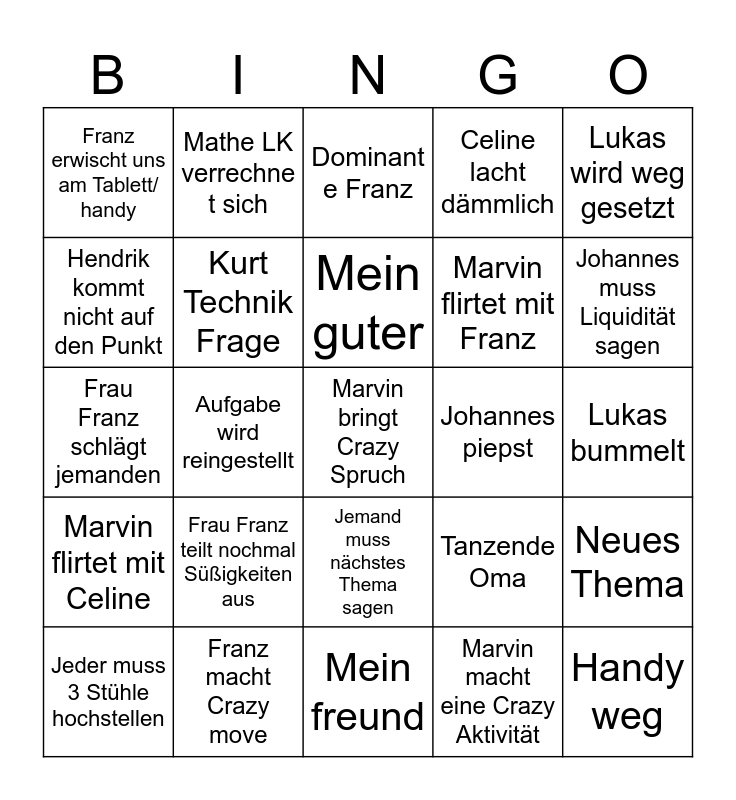This bingo card has a free space and 24 words: Frau Franz teilt nochmal Süßigkeiten aus, Franz macht Crazy move, Mein guter, Jeder muss 3 Stühle hochstellen, Lukas wird weg gesetzt, Franz erwischt uns am Tablett/ handy, Hendrik kommt nicht auf den Punkt, Mathe LK verrechne t sich, Johannes piepst, Jemand muss nächstes Thema sagen, Marvin flirtet mit Franz, Frau Franz schlägt jemanden, Tanzende Oma, Neues Thema, Kurt Technik Frage, Marvin macht eine Crazy Aktivität, Lukas bummelt, Dominant e Franz, Johannes muss Liquidität sagen, Aufgabe wird reingestellt, Handy weg, Marvin flirtet mit Celine, Celine lacht dämmlich and Mein freund.