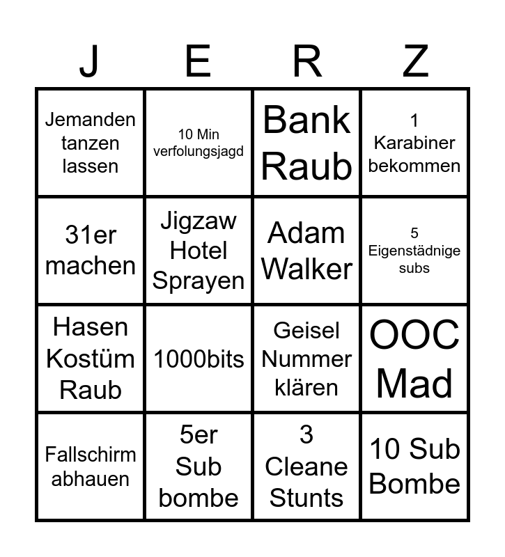 This bingo card has 16 words: 5er Sub bombe, OOC Mad, Bank Raub, Jemanden tanzen lassen, Hasen Kostüm Raub, 10 Min verfolungsjagd, Geisel Nummer klären, 3 Cleane Stunts, 31er machen, Jigzaw Hotel Sprayen, Fallschirm abhauen, 1 Karabiner bekommen, 1000bits, 5 Eigenstädnige subs, Adam Walker and 10 Sub Bombe.