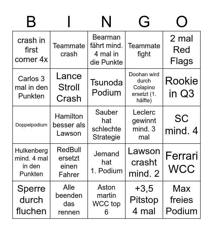 This bingo card has a free space and 24 words: RedBull ersetzt einen Fahrer, Alle beenden das rennen, Tsunoda Podium, Sperre durch fluchen, 2 mal Red Flags, crash in first corner 4x, Carlos 3 mal in den Punkten, Teammate crash, Leclerc gewinnt mind. 3 mal, Jemand hat 1. Podium, Doohan wird durch Colapino ersetzt (1. hälfte), Doppelpodium, Lawson crasht mind. 2, Ferrari WCC, Lance Stroll Crash, +3,5 Pitstop 4 mal, SC mind. 4, Bearman fährt mind. 4 mal in die Punkte, Rookie in Q3, Hamilton besser als Lawson, Max freies Podium, Hulkenberg mind. 4 mal in den Punkten, Teammate fight and Aston martin WCC top 6.