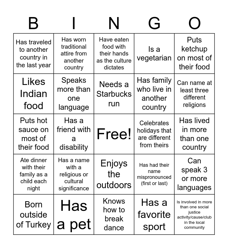 This bingo card has a free space and 29 words: Born outside of Turkey, Has attended a religious ceremony in a church/temple/ mosque other than their own, Has a friend with a disability, Has an interracial family member, Has traveled to another country in the last year, Have eaten food with their hands as the culture dictates, Speaks more than one language, Has a name with a religious or cultural significance, Celebrates holidays that are different from theirs, Has a pet, Has lived in more than one country, Is involved in more than one social justice activity/cause/club in the local community, Knows how to break dance, Has a favorite sport, Can name at least three different religions, Has had more than 2 jobs in their career, Enjoys the outdoors, Ate dinner with their family as a child each night, Puts ketchup on most of their food, Puts hot sauce on most of their food, Has had their name mispronounced (first or last), Has tried food from at least three different countries, Has family who live in another country, Likes Indian food, Is a vegetarian, Has worn traditional attire from another country, Can speak 3 or more languages, Needs a Starbucks run and Rode on the bus to get to school as a child.