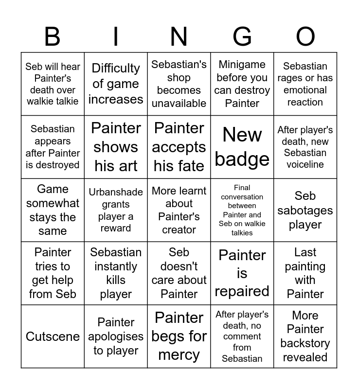 This bingo card has 25 words: Sebastian instantly kills player, Painter begs for mercy, Painter accepts his fate, Cutscene, Sebastian rages or has emotional reaction, Seb will hear Painter's death over walkie talkie, Sebastian appears after Painter is destroyed, Difficulty of game increases, Final conversation between Painter and Seb on walkie talkies, Seb doesn't care about Painter, New badge, Game somewhat stays the same, Painter is repaired, Last painting with Painter, Painter shows his art, More Painter backstory revealed, Seb sabotages player, Sebastian's shop becomes unavailable, After player's death, new Sebastian voiceline, Urbanshade grants player a reward, More learnt about Painter's creator, Painter apologises to player, Painter tries to get help from Seb, Minigame before you can destroy Painter and After player's death, no comment from Sebastian.