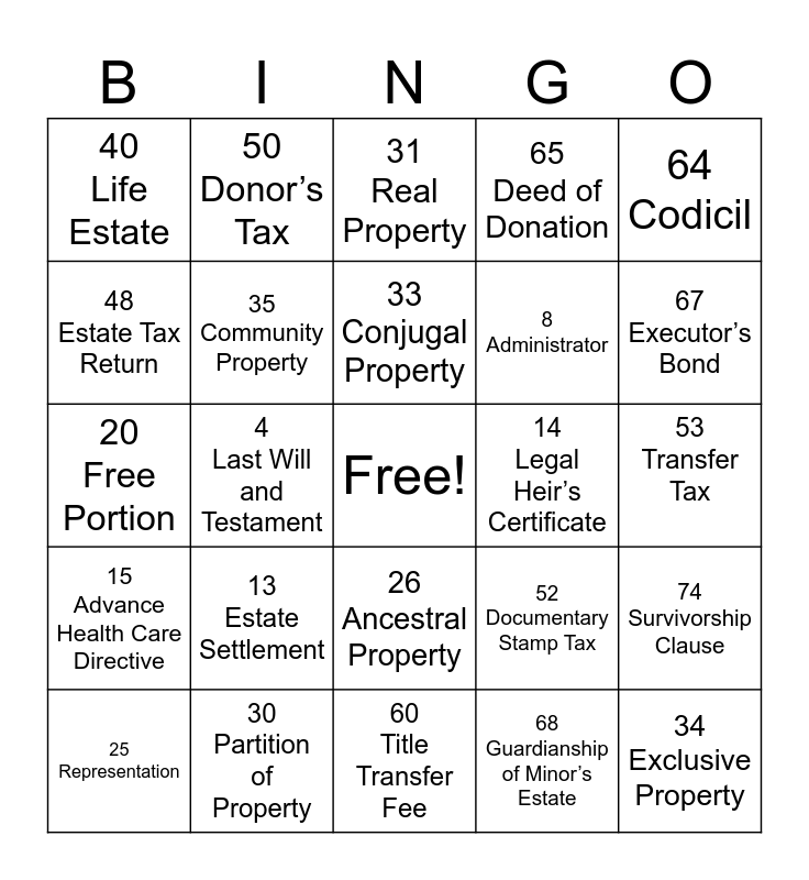 This bingo card has a free space and 75 words: 1 Estate Planning, 16 Compulsory Heirs, 31 Real Property, 46 Estate Tax, 61 Power of Attorney, 2 Estate, 17 Voluntary Heirs, 32 Personal Property, 47 Estate Tax Amnesty, 62 Revocable Trust, 3 Will, 18 Surviving Spouse, 33 Conjugal Property, 48 Estate Tax Return, 63 Irrevocable Trust, 4 Last Will and Testament, 19 Legitime, 34 Exclusive Property, 49 Inheritance Tax, 64 Codicil, 5 Testator, 20 Free Portion, 35 Community Property, 50 Donor’s Tax, 65 Deed of Donation, 6 Intestate Succession, 21 Preterition, 36 Liquid Assets, 51 Capital Gains Tax, 66 Deed of Sale, 7 Executor, 22 Disinheritance, 37 Fixed Assets, 52 Documentary Stamp Tax, 67 Executor’s Bond, 8 Administrator, 23 Illegitimate Child, 38 Capital Gains, 53 Transfer Tax, 68 Guardianship of Minor’s Estate, 9 Probate, 24 Adopted Child, 39 Leasehold Estate, 54 Probate Court Fees, 69 Life Insurance Policy, 10 Trust, 25 Representation, 40 Life Estate, 55 Notarial Fees, 70 Charitable Remainder Trust, 11 Trustee, 26 Ancestral Property, 41 Investment Portfolio, 56 Legal Processing Fees, 71 Wealth Protection, 12 Guardian, 27 Full-Blood Heir, 42 Cash Bequest, 57 Wealth Transfer Tax, 72 Endowment Fund, 13 Estate Settlement, 28 Half-Blood Heir, 43 Charitable Bequest, 58 Tax-Free Transfers, 73 Joint Ownership, 14 Legal Heir’s Certificate, 29 Escheat, 44 Trust Fund, 59 BIR Clearance for Estate, 74 Survivorship Clause, 15 Advance Health Care Directive, 30 Partition of Property, 45 Business Ownership Interest, 60 Title Transfer Fee and 75 Estate Freeze.