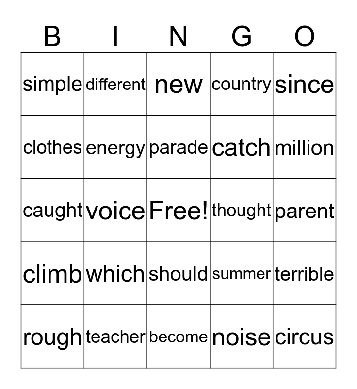 This bingo card has a free space and 24 words: which, teacher, parade, rough, since, simple, clothes, different, thought, should, catch, caught, summer, terrible, energy, noise, parent, new, million, voice, circus, climb, country and become.
