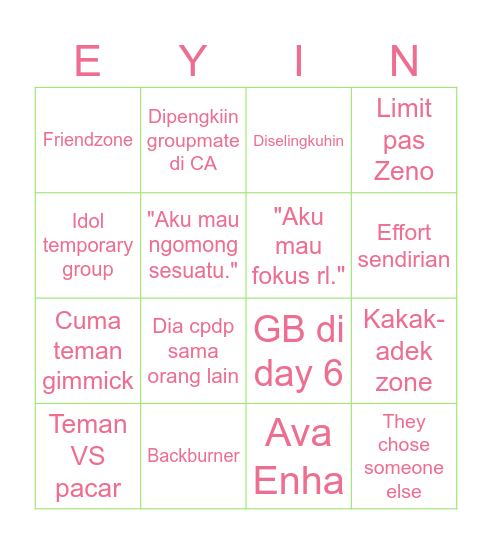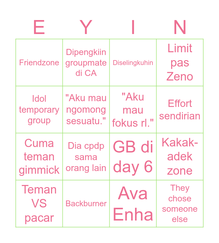 This bingo card has 16 words: Backburner, Kakak-adek zone, Diselingkuhin, Friendzone, Cuma teman gimmick, Dipengkiin groupmate di CA, GB di day 6, Ava Enha, Idol temporary group, "Aku mau ngomong sesuatu.", Teman VS pacar, Limit pas Zeno, Dia cpdp sama orang lain, Effort sendirian, "Aku mau fokus rl." and They chose someone else.