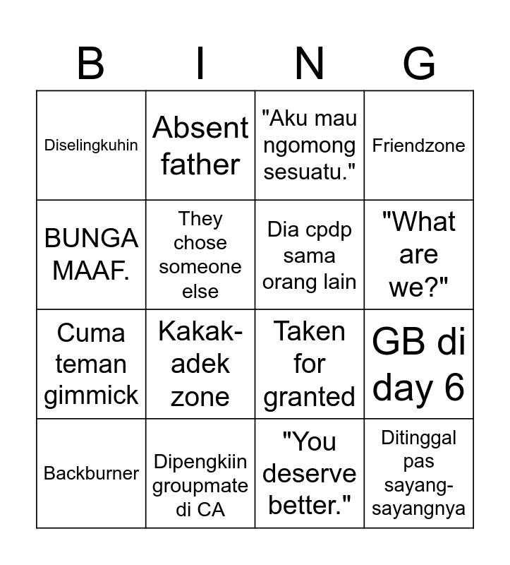 This bingo card has 16 words: Dipengkiin groupmate di CA, GB di day 6, "Aku mau ngomong sesuatu.", Diselingkuhin, Cuma teman gimmick, Absent father, Taken for granted, "You deserve better.", BUNGA MAAF., They chose someone else, Backburner, Friendzone, Kakak-adek zone, "What are we?", Dia cpdp sama orang lain and Ditinggal pas sayang-sayangnya.