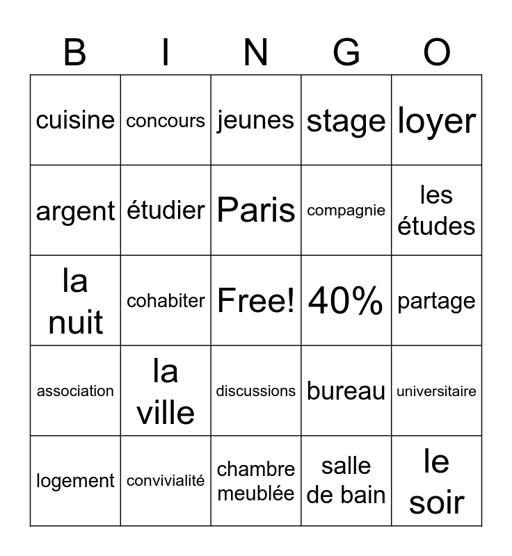 This bingo card has a free space and 29 words: logement, seniors, cohabiter, étudiante, cuisine, jeunes, étudier, la ville, 40%, convivialité, partage, le soir, chambre meublée, salle de bain, les études, personnes agées, discussions, association, loyer, la nuit, bureau, appartement, compagnie, argent, stage, concours, universitaire, Paris and apéro.
