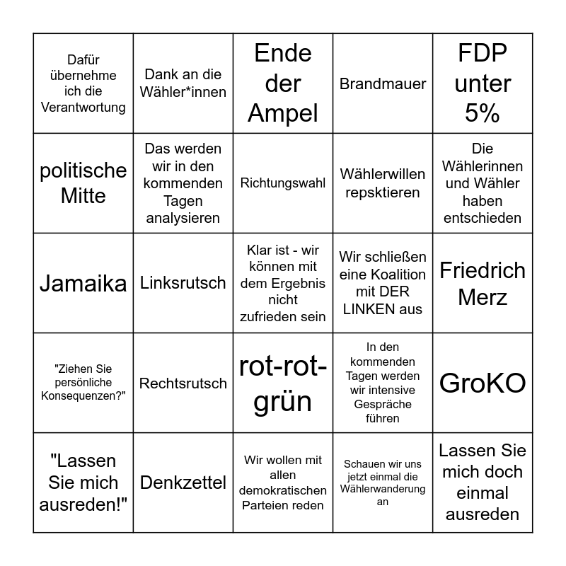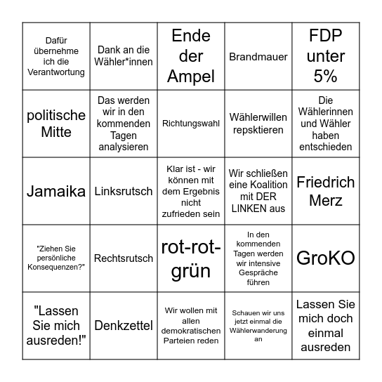 This bingo card has 31 words: Wir wollen mit allen demokratischen Parteien reden, ...unseren Wählerinnen und Wählern danken, Linksrutsch, Überraschend eindeutig, Dafür übernehme ich die Verantwortung, Ende der Ampel, Das werden wir in den kommenden Tagen analysieren, In den kommenden Tagen werden wir intensive Gespräche führen, Wir schließen eine Koalition mit DER LINKEN aus, Schauen wir uns jetzt einmal die Wählerwanderung an, Friedrich Merz, Klar ist - wir können mit dem Ergebnis nicht zufrieden sein, Lassen Sie mich doch einmal ausreden, historisch schlechteste Wahlergebnis, Die Wählerinnen und Wähler haben entschieden, klarer Regierungs-auftrag, GroKO, Rechtsrutsch, "Ziehen Sie persönliche Konsequenzen?", rot-rot-grün, FDP unter 5%, Kenia Koalition, "Lassen Sie mich ausreden!", Dank an die Wähler*innen, Wählerwillen repsktieren, politische Mitte, Brandmauer, Jamaika, Denkzettel, Richtungswahl and Silberlocke.
