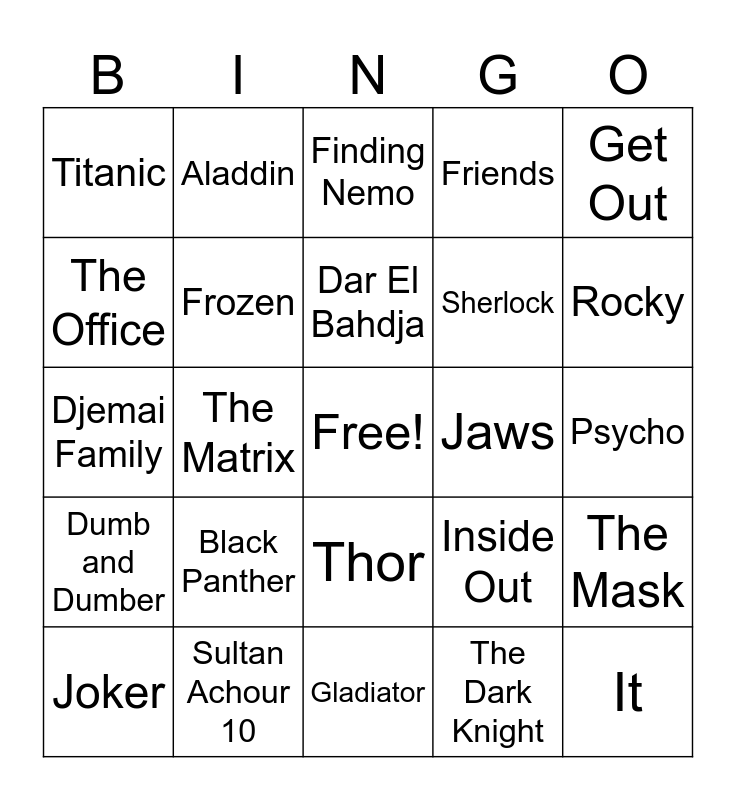 This bingo card has a free space and 31 words: Gladiator, The Godfather, The Matrix, Lion King, Titanic, Finding Nemo, Frozen, Inside Out, Jaws, The Dark Knight, Psycho, It, Shrek, Home Alone, Rocky, Superbad, The Mask, Black Panther, Dumb and Dumber, Thor, Get Out, Harry Potter, Joker, Aladdin, Sherlock, The Office, Friends, Djemai Family, Sultan Achour 10, Dar El Bahdja and Wlad Lahlal.