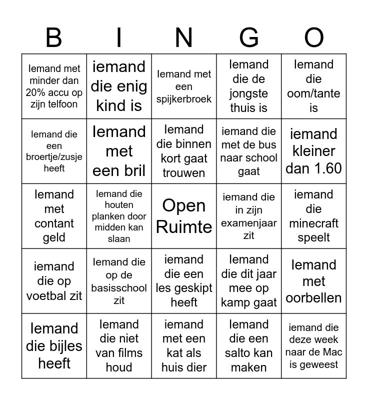 This bingo card has a free space and 24 words: Iemand die op de basisschool zit, Iemand die niet van films houd, Iemand die binnen kort gaat trouwen, Iemand die bijles heeft, Iemand die oom/tante is, Iemand met minder dan 20% accu op zijn telfoon, Iemand die een broertje/zusje heeft, iemand die enig kind is, iemand die in zijn examenjaar zit, iemand die een les geskipt heeft, iemand die met de bus naar school gaat, Iemand met contant geld, Iemand die dit jaar mee op kamp gaat, Iemand met oorbellen, Iemand met een bril, Iemand die een salto kan maken, iemand die minecraft speelt, Iemand met een spijkerbroek, iemand kleiner dan 1.60, Iemand die houten planken door midden kan slaan, iemand die deze week naar de Mac is geweest, iemand die op voetbal zit, Iemand die de jongste thuis is and iemand met een kat als huis dier.