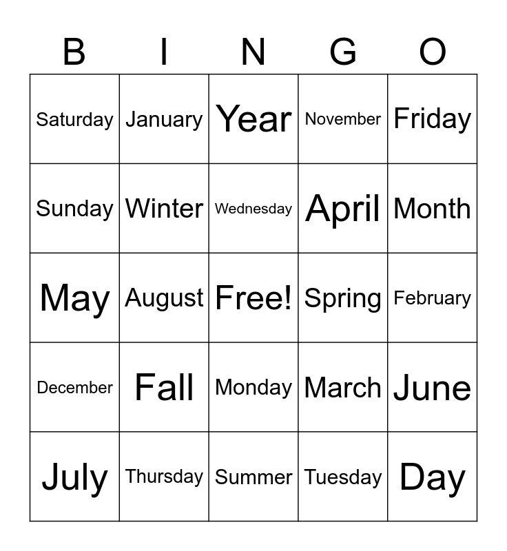 This bingo card has a free space and 26 words: Monday, Tuesday, Wednesday, Thursday, Friday, Saturday, Sunday, January, February, March, April, May, June, July, August, September, November, December, Year, Day, Month, Summer, Spring, Fall, Winter and Date.