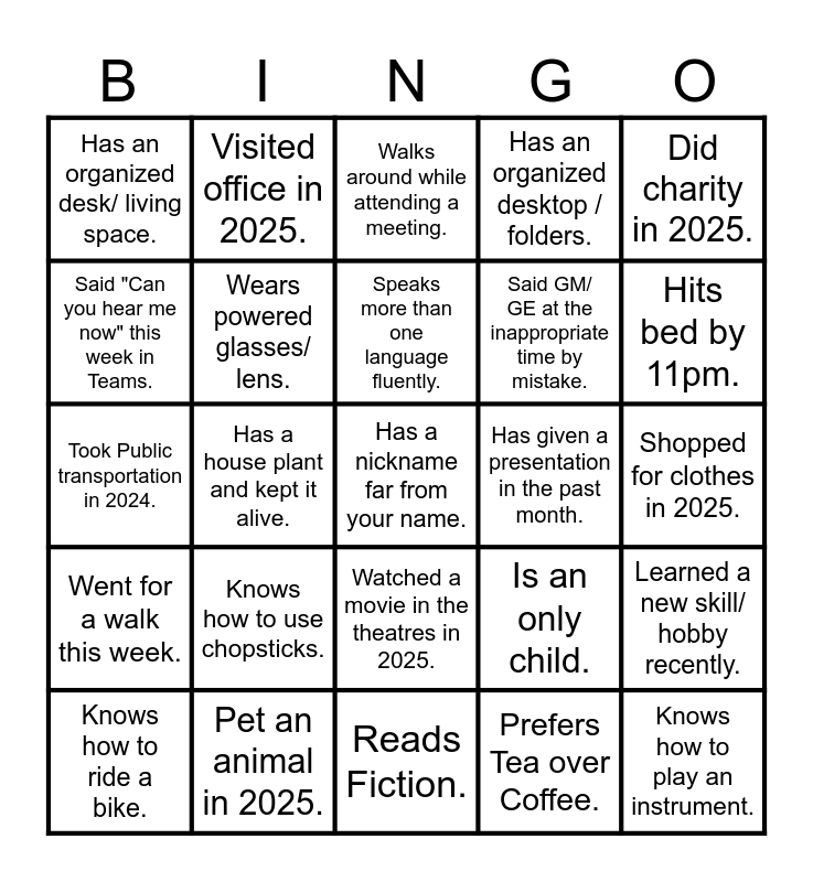 This bingo card has a free space and 24 words: Knows how to use chopsticks., Pet an animal in 2025., Speaks more than one language fluently., Knows how to ride a bike., Did charity in 2025., Has an organized desk/ living space., Said "Can you hear me now" this week in Teams., Visited office in 2025., Has given a presentation in the past month., Watched a movie in the theatres in 2025., Said GM/ GE at the inappropriate time by mistake., Took Public transportation in 2024., Is an only child., Learned a new skill/ hobby recently., Wears powered glasses/ lens., Prefers Tea over Coffee., Shopped for clothes in 2025., Walks around while attending a meeting., Hits bed by 11pm., Has a house plant and kept it alive., Knows how to play an instrument., Went for a walk this week., Has an organized desktop / folders. and Reads Fiction..