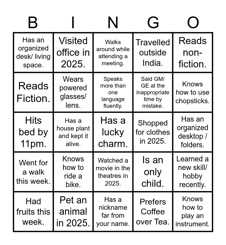 This bingo card has a free space and 24 words: Knows how to ride a bike., Pet an animal in 2025., Speaks more than one language fluently., Had fruits this week., Reads non-fiction., Has an organized desk/ living space., Reads Fiction., Visited office in 2025., Shopped for clothes in 2025., Watched a movie in the theatres in 2025., Said GM/ GE at the inappropriate time by mistake., Hits bed by 11pm., Is an only child., Learned a new skill/ hobby recently., Wears powered glasses/ lens., Prefers Coffee over Tea., Has an organized desktop / folders., Walks around while attending a meeting., Knows how to use chopsticks., Has a house plant and kept it alive., Knows how to play an instrument., Went for a walk this week., Travelled outside India. and Has a nickname far from your name..