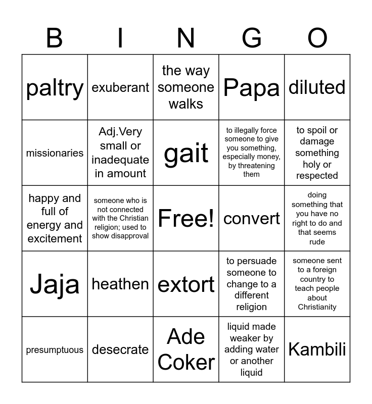 This bingo card has a free space and 24 words: heathen, desecrate, gait, presumptuous, diluted, paltry, missionaries, exuberant, convert, extort, to illegally force someone to give you something, especially money, by threatening them, happy and full of energy and excitement, to persuade someone to change to a different religion, someone sent to a foreign country to teach people about Christianity, Adj.Very small or inadequate in amount, liquid made weaker by adding water or another liquid, doing something that you have no right to do and that seems rude, the way someone walks, to spoil or damage something holy or respected, someone who is not connected with the Christian religion; used to show disapproval, Kambili, Jaja, Papa and Ade Coker.