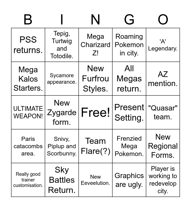 This bingo card has a free space and 24 words: Snivy, Piplup and Scorbunny., Sky Battles Return., New Furfrou Styles., Really good trainer customisation., 'A' Legendary., PSS returns., Mega Kalos Starters., Tepig, Turtwig and Totodile., Present Setting., Team Flare(?), All Megas return., ULTIMATE WEAPON!, Frenzied Mega Pokemon., New Regional Forms., Sycamore appearance., Graphics are ugly., "Quasar" team., Mega Charizard Z!, AZ mention., New Zygarde form., Player is working to redevelop city., Paris catacombs area., Roaming Pokemon in city. and New Eeveelution..