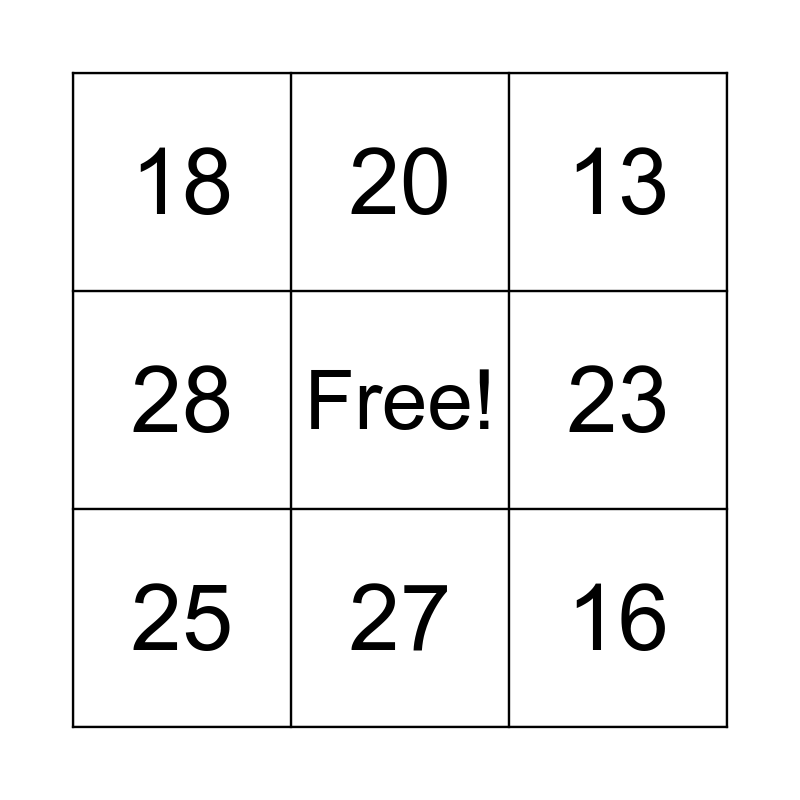 This bingo card has a free space and 20 words: 11, 12, 13, 14, 15, 16, 17, 18, 19, 20, 21, 22, 23, 24, 25, 26, 27, 28, 29 and 30.
