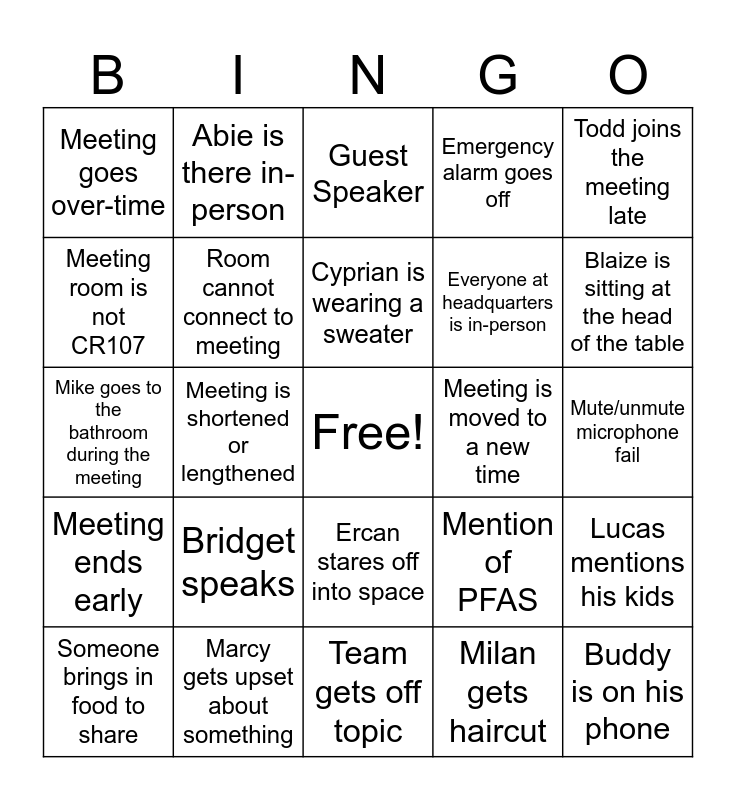 This bingo card has a free space and 27 words: Mention of PFAS, Someone mentions going on a trip, Everyone at headquarters is in-person, Team gets off topic, Meeting room is not CR107, Guest Speaker, Abie is there in-person, Meeting ends early, Meeting is moved to a new time, Lucas mentions his kids, Mike goes to the bathroom during the meeting, Emergency alarm goes off, Someone brings in food to share, Marcy gets upset about something, Blaize is sitting at the head of the table, Shelly gets lost in her question, Room cannot connect to meeting, Cyprian is wearing a sweater, Bridget speaks, Meeting goes over-time, Mute/unmute microphone fail, Milan gets haircut, Meeting is shortened or lengthened, Buddy is on his phone, Ercan stares off into space, Todd joins the meeting late and Bestic talks about a movie.