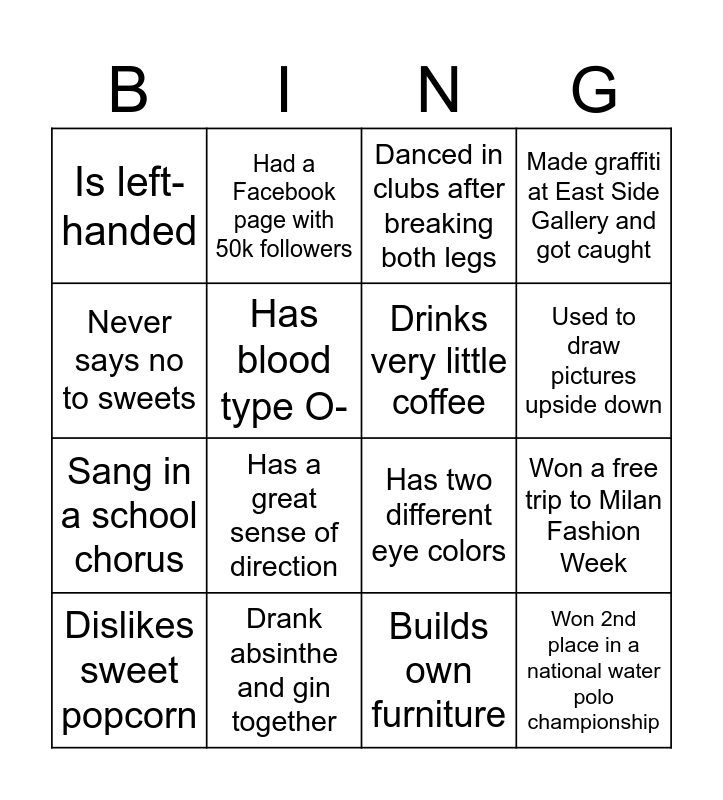 This bingo card has 16 words: Drank absinthe and gin together, Won a free trip to Milan Fashion Week, Danced in clubs after breaking both legs, Is left-handed, Sang in a school chorus, Had a Facebook page with 50k followers, Has two different eye colors, Builds own furniture, Never says no to sweets, Has blood type O-, Dislikes sweet popcorn, Made graffiti at East Side Gallery and got caught, Has a great sense of direction, Used to draw pictures upside down, Drinks very little coffee and Won 2nd place in a national water polo championship.