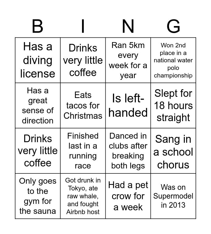 This bingo card has 16 words: Got drunk in Tokyo, ate raw whale, and fought Airbnb host, Sang in a school chorus, Ran 5km every week for a year, Has a diving license, Drinks very little coffee, Drinks very little coffee, Danced in clubs after breaking both legs, Had a pet crow for a week, Has a great sense of direction, Eats tacos for Christmas, Only goes to the gym for the sauna, Won 2nd place in a national water polo championship, Finished last in a running race, Slept for 18 hours straight, Is left-handed and Was on Supermodel in 2013.