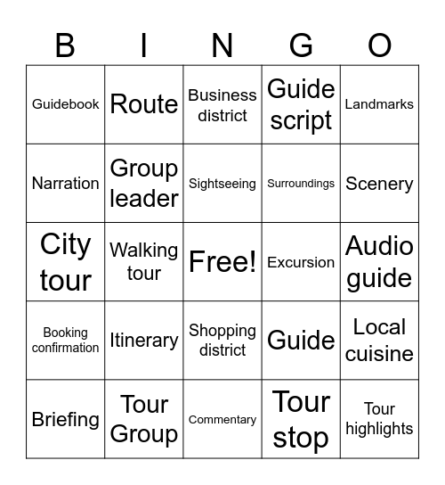 This bingo card has a free space and 24 words: Itinerary, Tour Group, Sightseeing, Briefing, Landmarks, Guidebook, Narration, Route, Excursion, Shopping district, Surroundings, City tour, Guide, Local cuisine, Group leader, Tour stop, Audio guide, Business district, Scenery, Walking tour, Tour highlights, Booking confirmation, Guide script and Commentary.