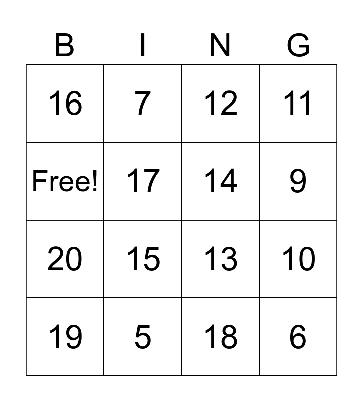 This bingo card has 16 words: 5, 10, 12, 16, 20, 7, 13, 18, Free!, 17, 19, 11, 15, 9, 14 and 6.
