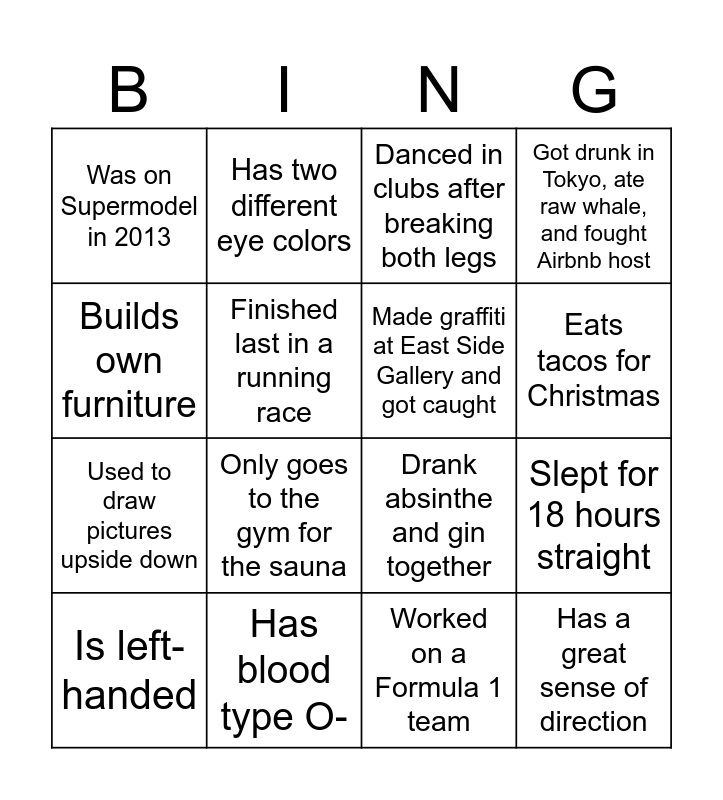 This bingo card has 16 words: Has blood type O-, Slept for 18 hours straight, Danced in clubs after breaking both legs, Was on Supermodel in 2013, Used to draw pictures upside down, Has two different eye colors, Drank absinthe and gin together, Worked on a Formula 1 team, Builds own furniture, Finished last in a running race, Is left-handed, Got drunk in Tokyo, ate raw whale, and fought Airbnb host, Only goes to the gym for the sauna, Eats tacos for Christmas, Made graffiti at East Side Gallery and got caught and Has a great sense of direction.