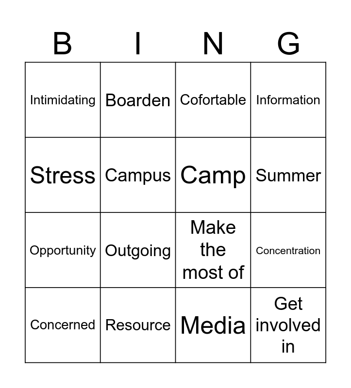 This bingo card has 16 words: Resource, Concentration, Cofortable, Intimidating, Opportunity, Boarden, Make the most of, Media, Stress, Campus, Concerned, Information, Outgoing, Summer, Camp and Get involved in.
